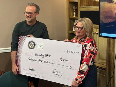 For our Christmas meeting, members of the Rotary Club of Calgary Olympic spent an evening volunteering with Basically Babies, a local charity that provides layettes to mothers who need assistance with newborn children. President James Fuerderer also presented Basically Babies with a donation to its work.
